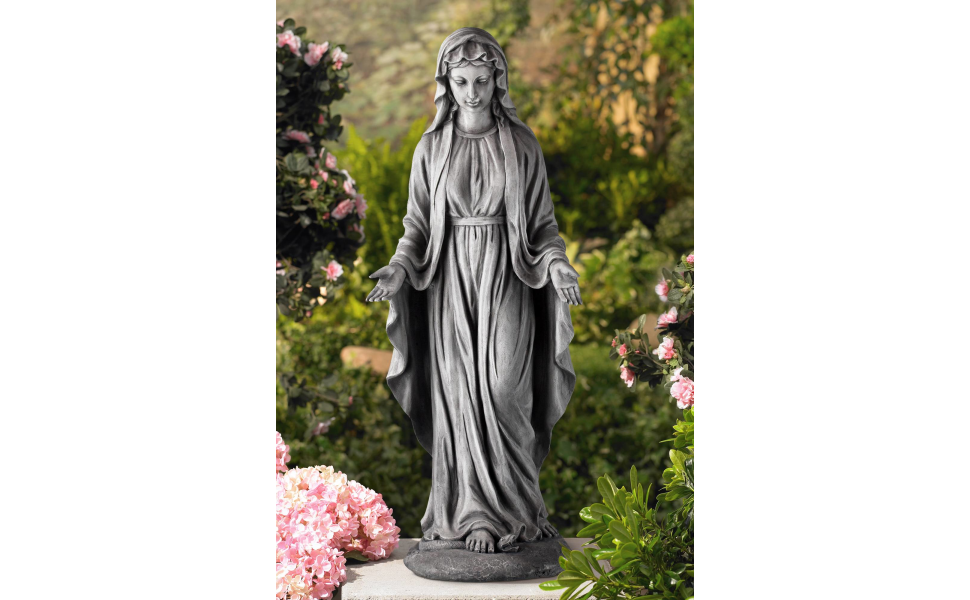 A classic gray stone finish makes this Virgin Mary outdoor statue a wonderful Home Decoration, porch, or patio accent. A peaceful, elegant design with graceful details.